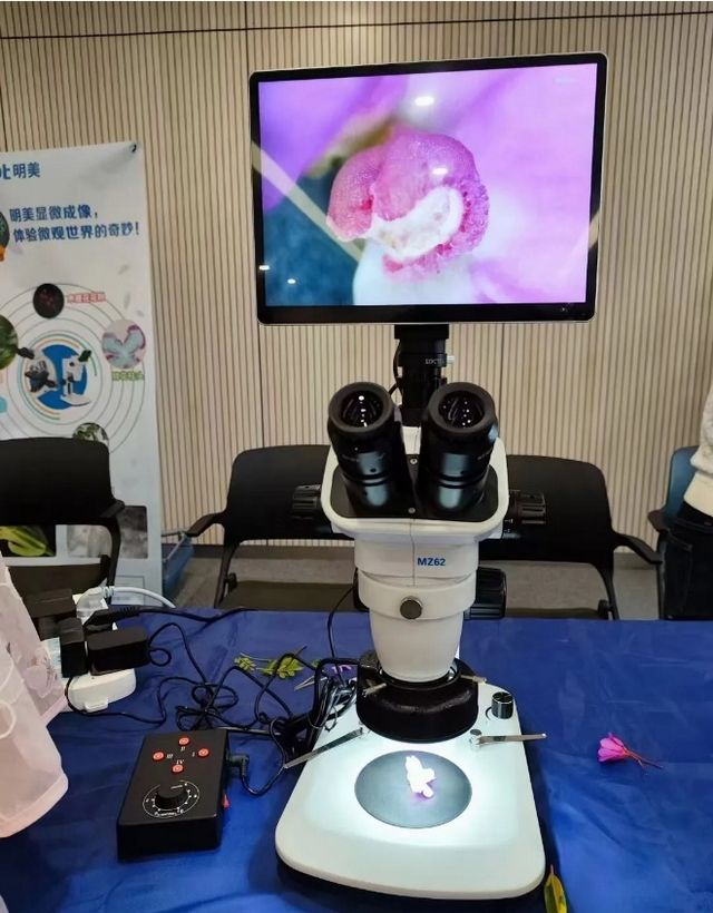活動現(xiàn)場,Mshot明美精心準備了兩款一體式數(shù)碼顯微鏡,分別由體視顯微鏡MZ62、生物顯微鏡ML11搭配一體式平板相機MD28-A組成,不僅可以從目鏡觀察,還能在平板屏幕上同步顯示鏡下圖像,新奇體驗不僅讓孩子們能夠親身感受科技的魅力,更在游玩中學(xué)習(xí)了科學(xué)知識,探索了神秘的微觀世界。